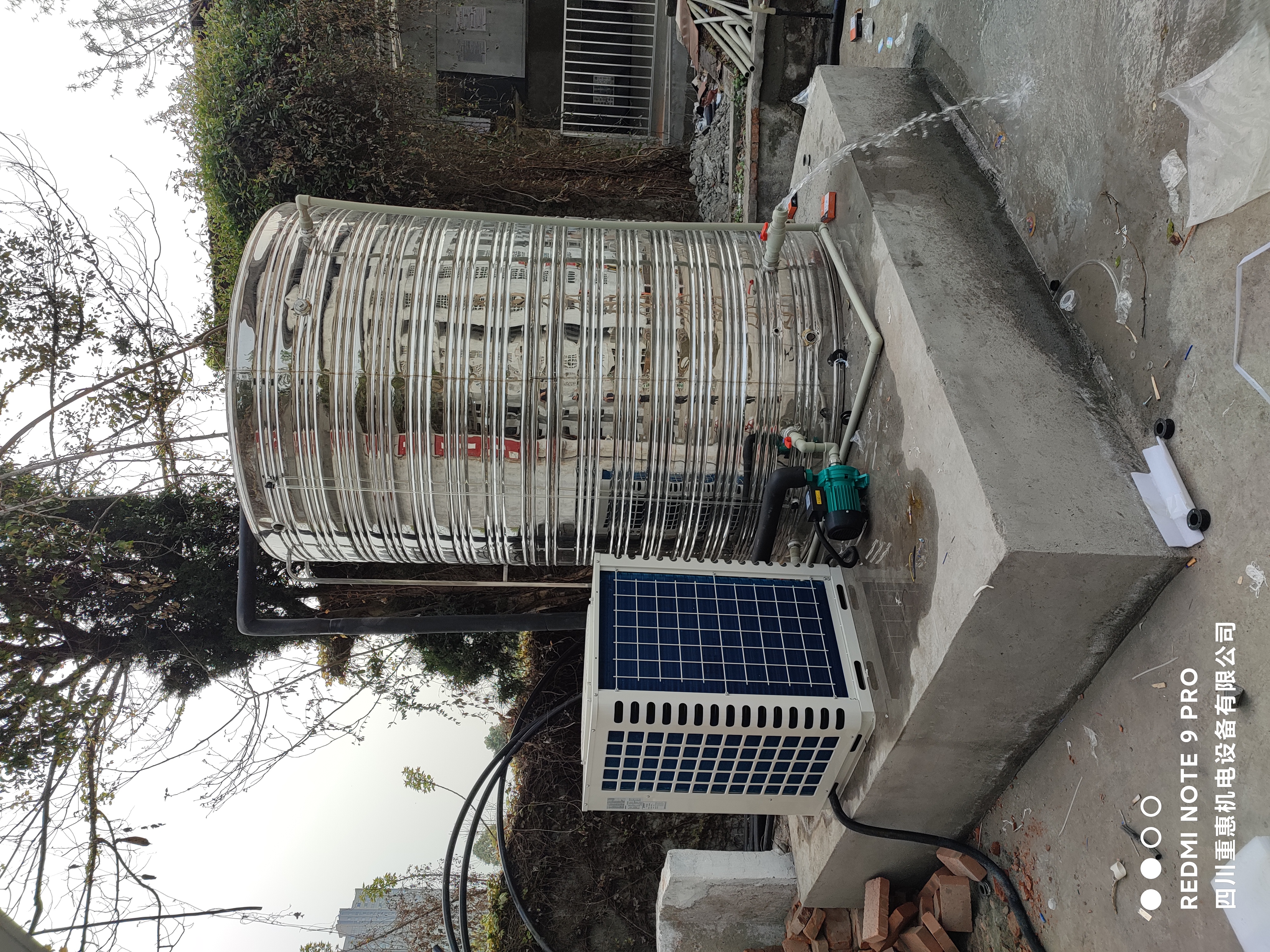 由四川重惠機電設備有限公司安裝的5匹空氣能熱水器位于成都市,配置3噸不銹鋼保溫水箱,日供應3噸以上的生活熱水。